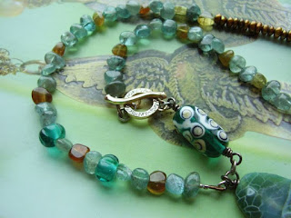 Aavistus-korun riipuksessa pronssinen spiraali (LesleyWatt), erikoisen ihana etsattu akaatti(kiitos,Vikki!) - kasvua, pyörteitä, versoja myös Saran lamppuhelmessä ja lukkokin on pronssia. Apatiittien keskellä on myös pari ihanaista vihreää isoa 'siementä', ne olen muistaakseni tilannut Anzulta ammoin.